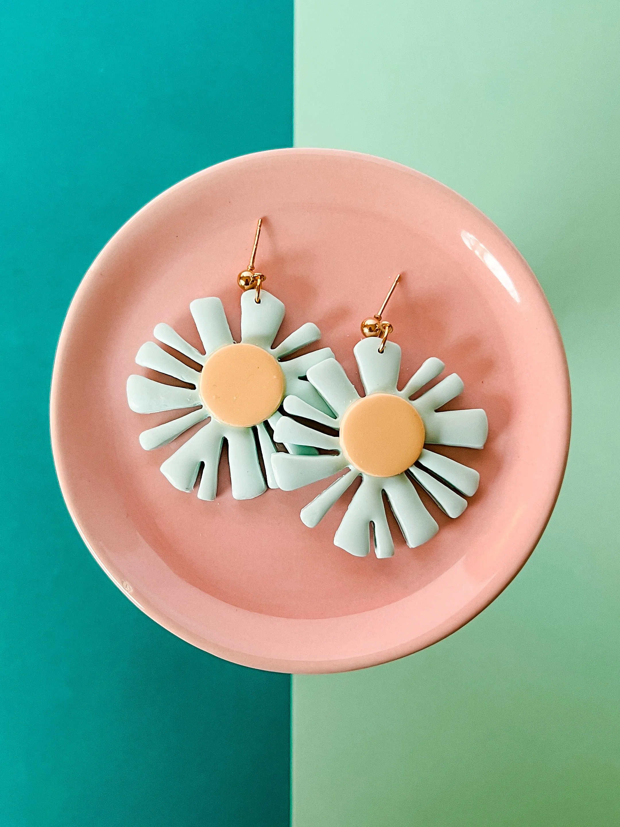 Our earrings are handmade in Greenville. South Carolina. Each item will have small variations and possible imperfections. Clay earrings are made start to finish from a block of clay. Each piece is unique. Each item is lovingly rolled out, cut, baked, sanded and assembled by hand from polymer clay.
